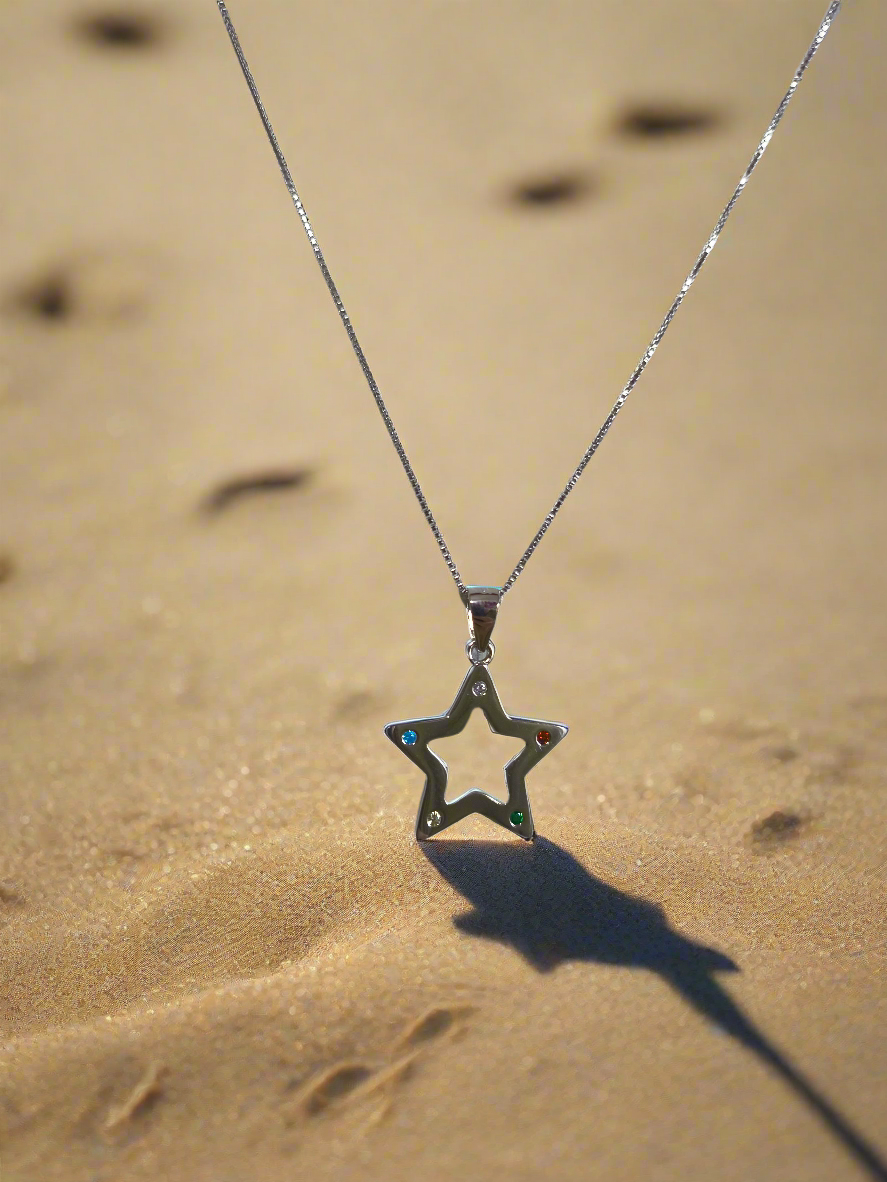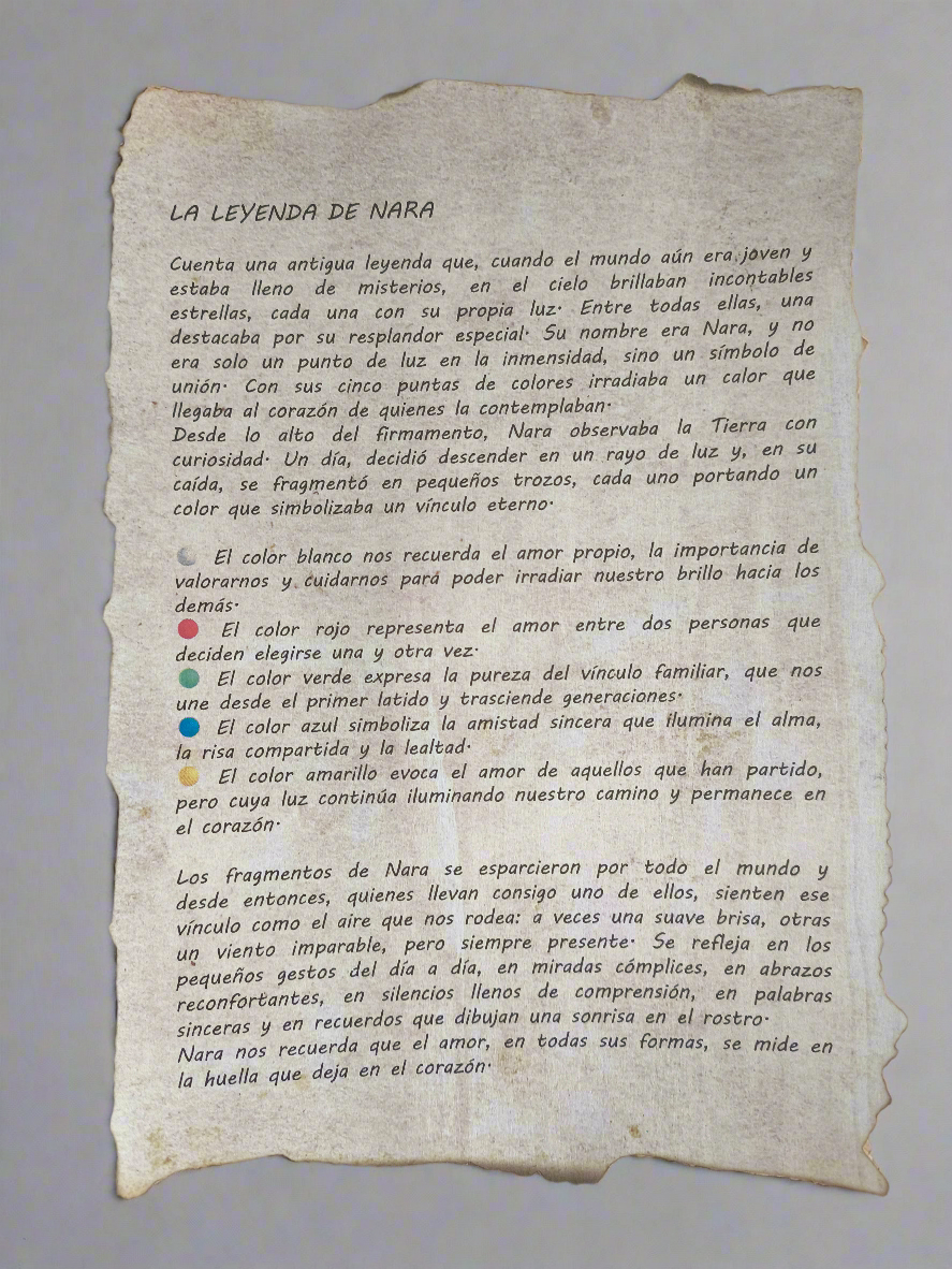 En el corazón del pack, encontrarás el colgante Nara, una estrella elaborada en plata de ley 925 con baño de rodio, con circonitas de colores que representan cinco vínculos eternos: